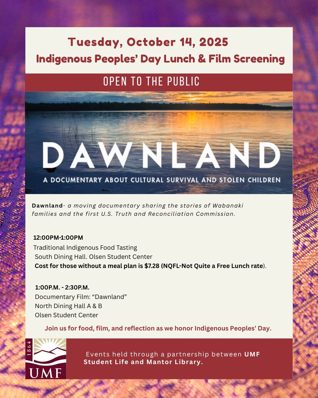 FARMINGTON, ME (October 7, 2025)—Members of the public are invited to the University of Maine at Farmington for the annual Indigenous Peoples’ Day Lunch and Film Screening on Tuesday, Oct. 14, from 12-2 p.m. This event is open to the public and presented in partnership between UMF Student Life and Mantor Library.